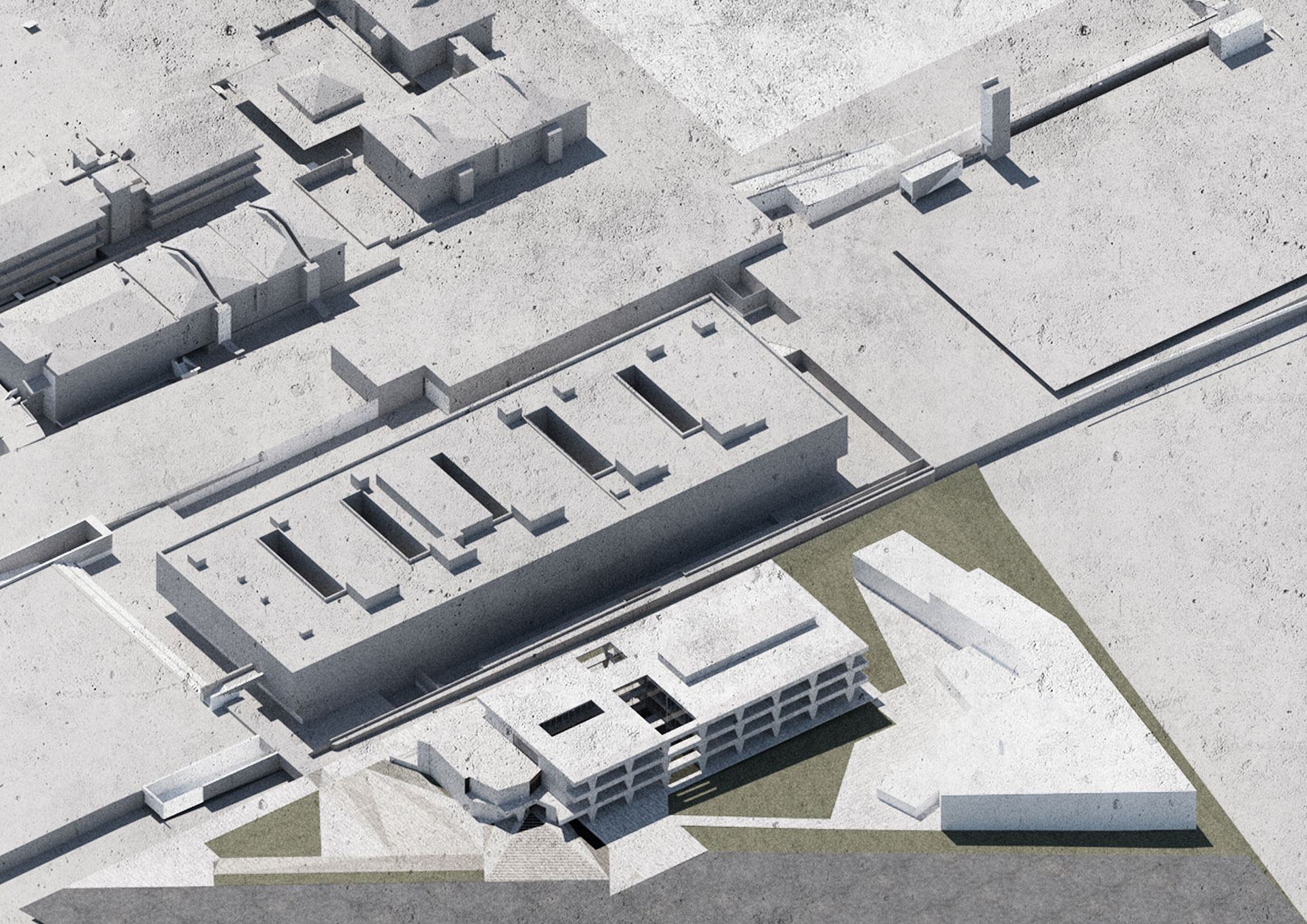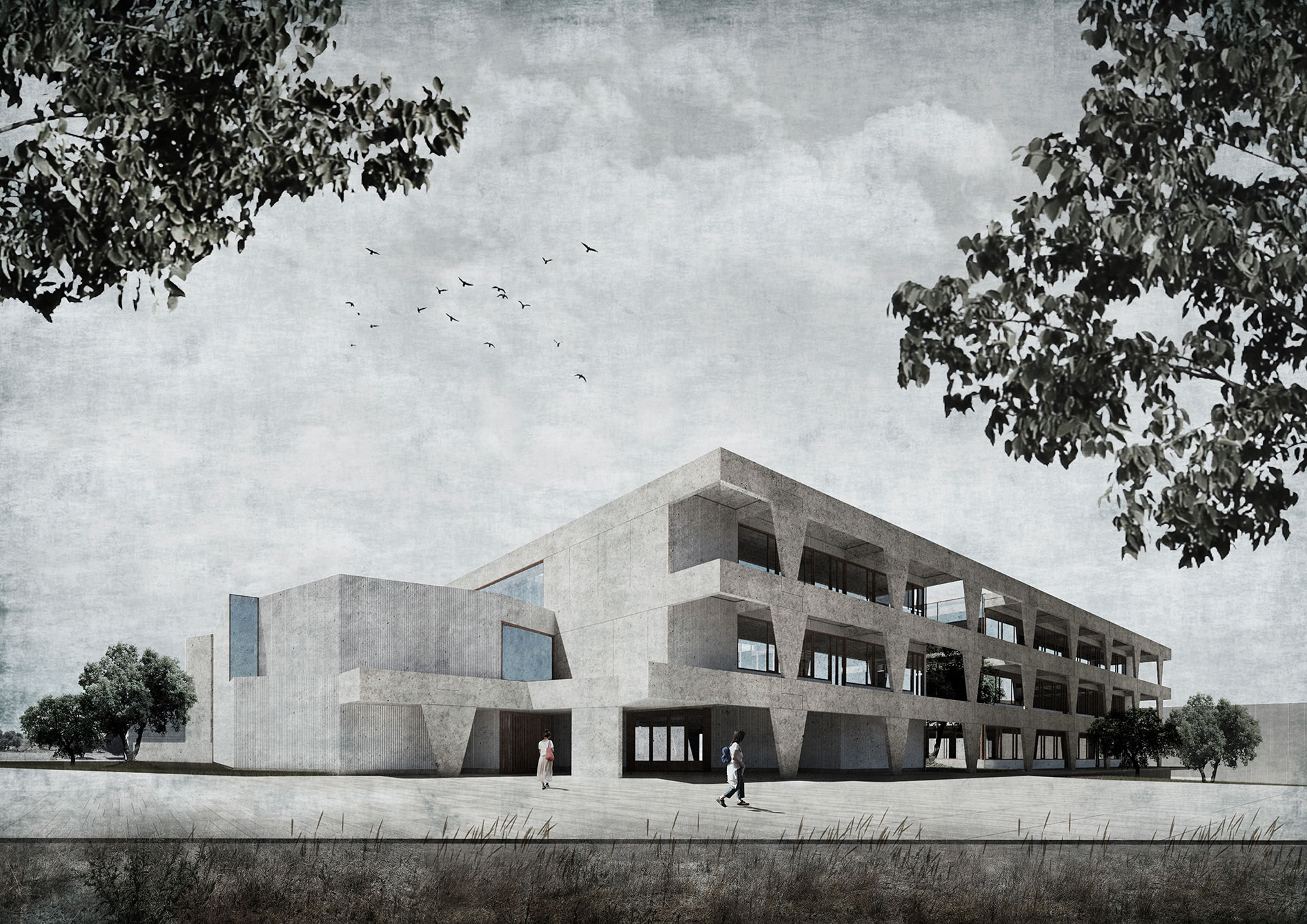 El edificio se organiza en dos áreas principales: una zona docente (talleres, aulas, laboratorios) y una zona académica (departamentos, tutorías, accesos). Ambas áreas están separadas por un espacio exterior ajardinado que integra el paisaje natural, haciendo que los usuarios se conecten con el entorno mientras transitan entre ellas. Además, el edificio incorpora vacíos en su sección que enriquecen los espacios interiores, como un «claustro cubierto» para circulación, un patio que recibe luz natural indirecta, y un vacío en el área de departamentos que favorece la ventilación y luz natural. Estos vacíos no solo mejoran la calidad del ambiente interior, sino que también contribuyen a la eficiencia energética del edificio, ayudando a reducir el consumo energético mediante un diseño funcional y consciente del medio ambiente.