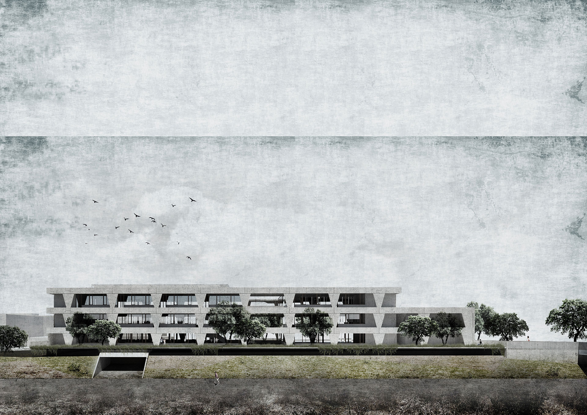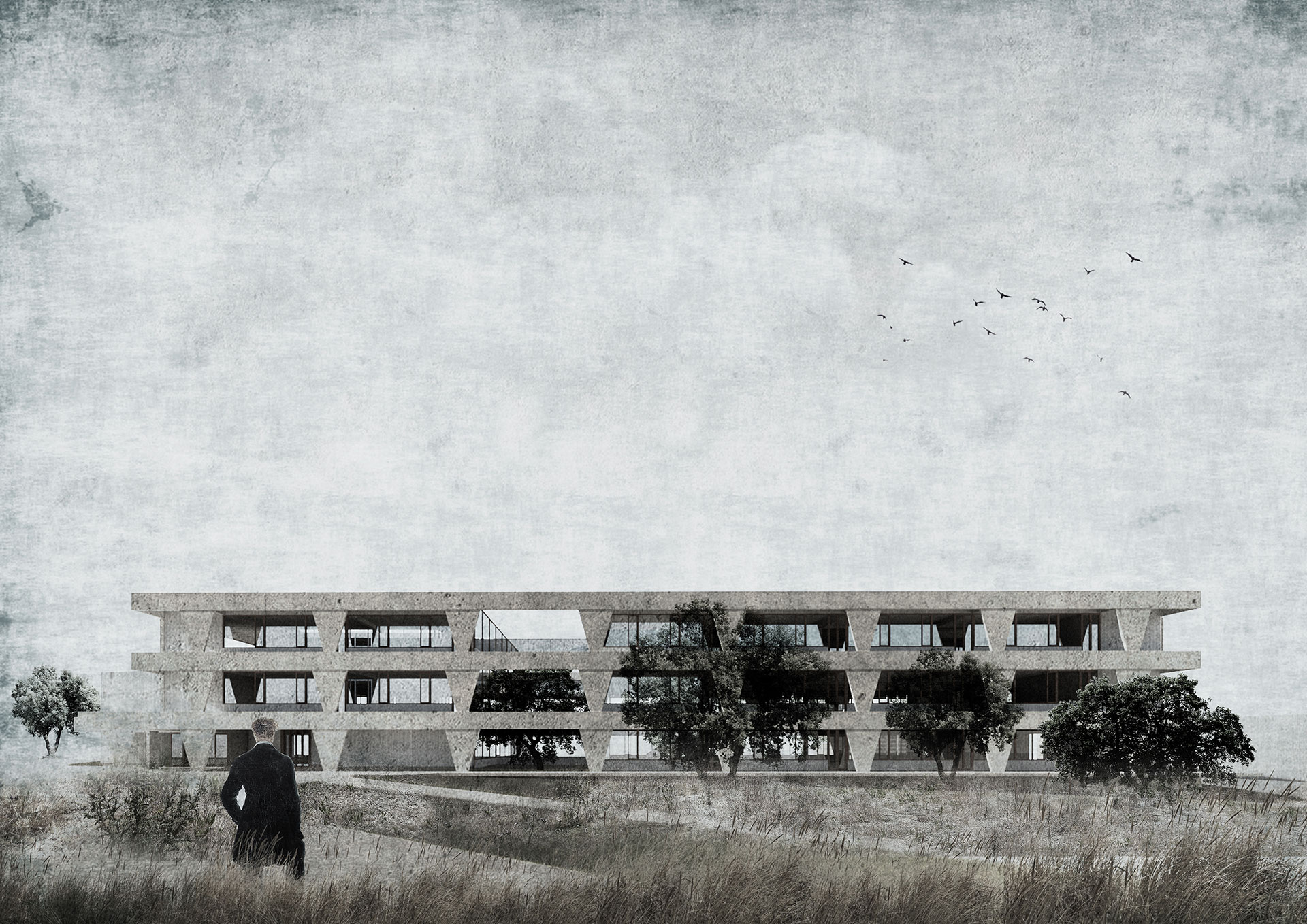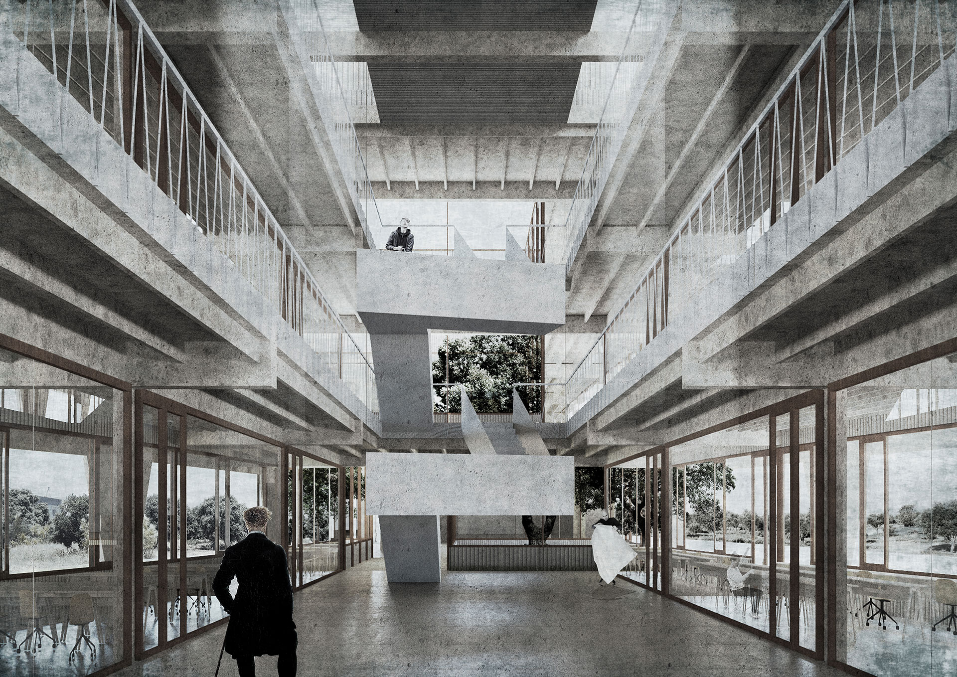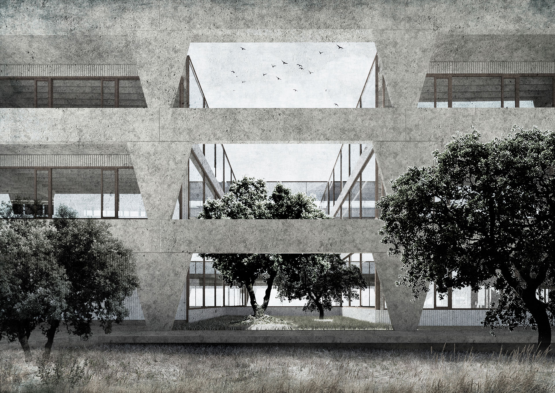 El diseño estructural del edificio responde a una organización clara y ordenada, utilizando una estructura rectangular que se adapta al contexto solar, favoreciendo la entrada de luz natural sin sufrir de sobrecalentamiento. La estructura modular se caracteriza por una organización espacial que no interrumpe el paisaje, sino que se “apoya” sobre él, creando un vínculo visual y físico con el entorno. Esto permite la creación de espacios intermedios, como terrazas ajardinadas y patios de doble altura, que extienden visualmente el espacio hacia el exterior y proporcionan zonas de expansión y trabajo al aire libre.