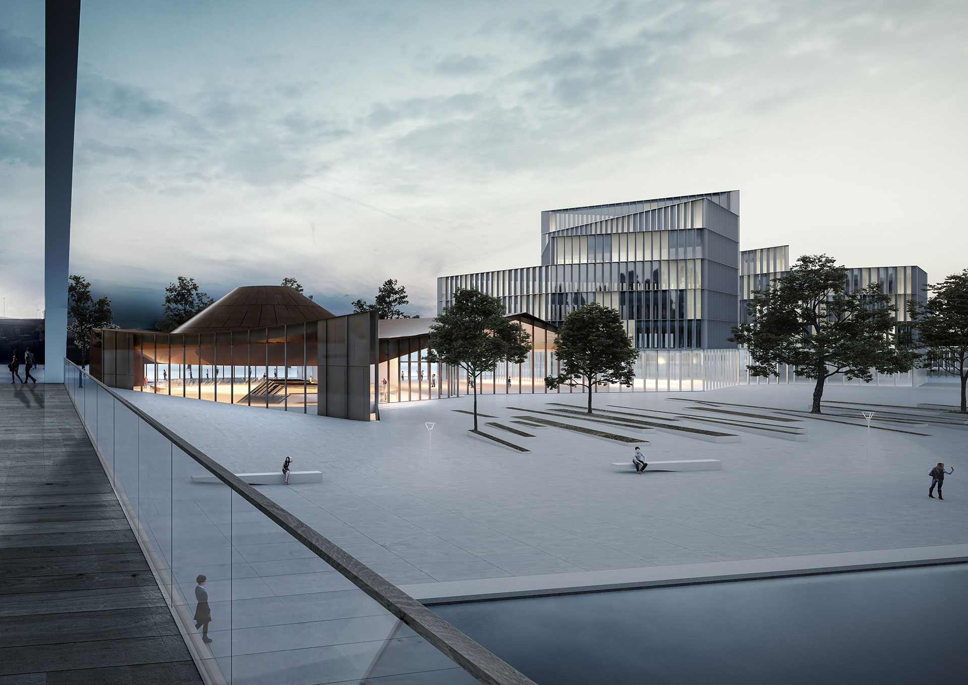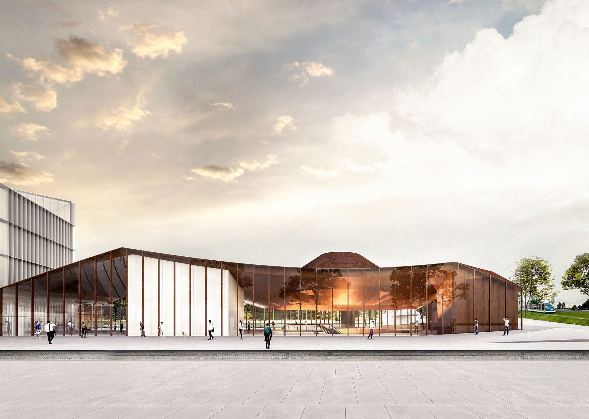 La misma idea de cráter o volcán se convertirá en el motivo de fondo para la configuración externa de la estación. Una referencia a la naturaleza, a la idea de conexión con el interior de la tierra y el exterior urbano. La imagen industrial asociada con el edificio se completa con el uso del bronce en la configuración de la cubierta. Un volumen que nos recuerda a las chimeneas y sistemas de aireación de los grandes edificios industriales. El volumen que alberga la estación consigue así una gran visibilidad por su forma, su geometría y sus materiales, y emerge claramente en el sitio, apoyado en un zócalo que alberga el área comercial y los accesos de pasajeros.