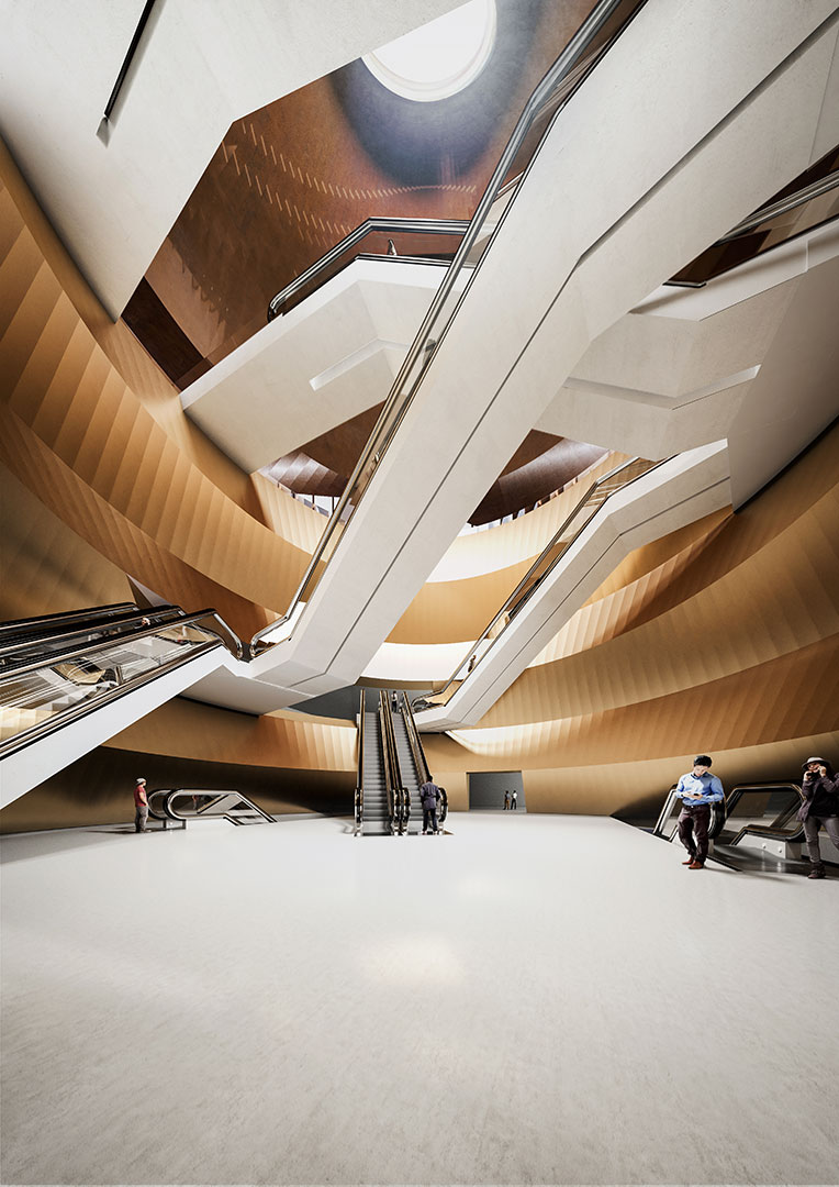 Para la configuración de la “perforación” de la tierra en su camino hacia los andenes, trabajamos con una idea inspirada en el universo artístico de Brancusi y sus “torres sin fin”. Un cilindro de latón dorado, continuo, cuya forma está hecha a base de apilamientos de secciones troncopiramidales doradas, define toda la sección vertical.