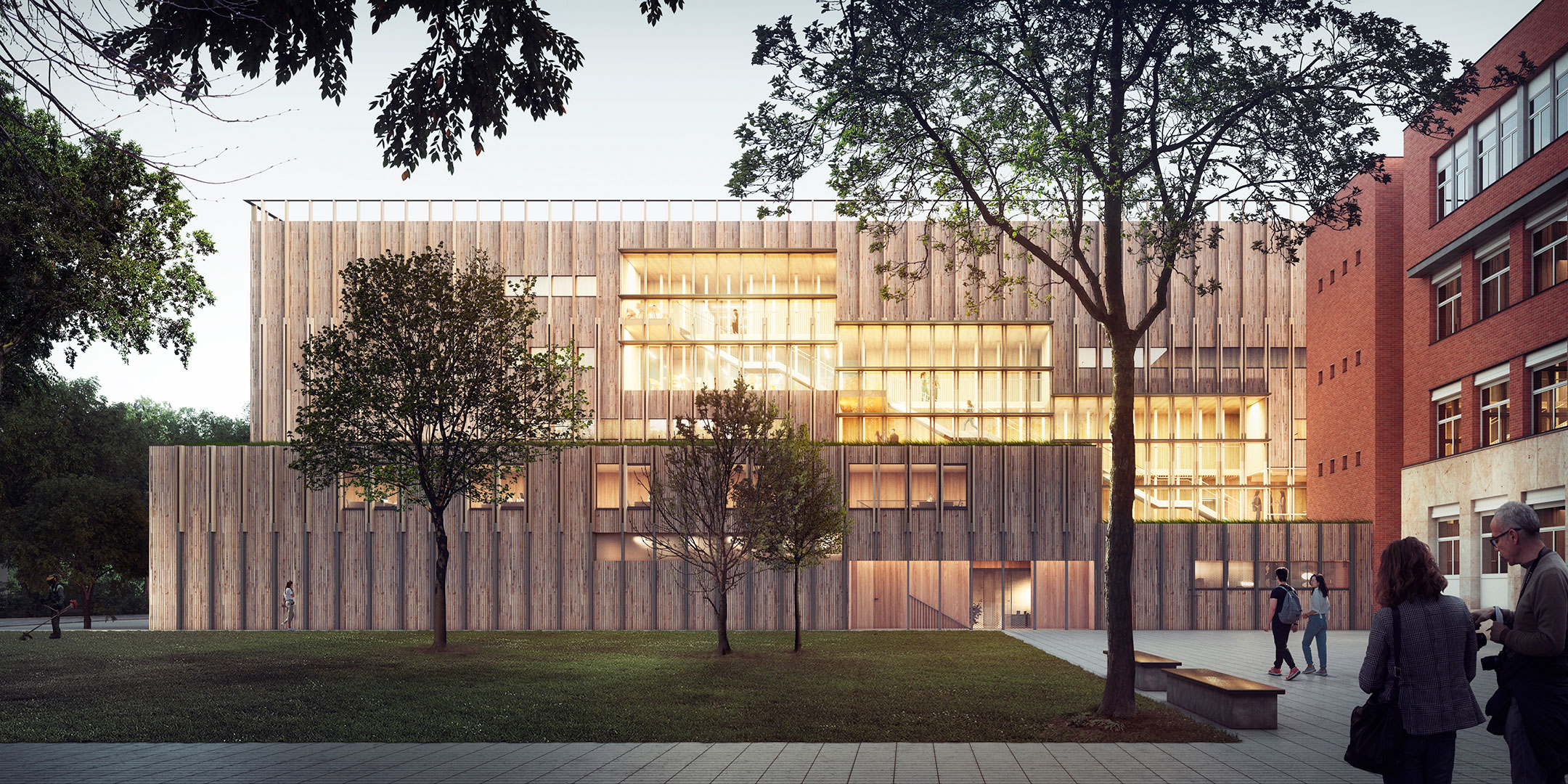 El edificio, destinado a usos universitarios, se organiza en un volumen lineal y compacto, orientado norte-sur, con cuatro niveles sobre rasante y un sótano. Su forma busca integrarse con el conjunto hospitalario de Navarra, respetando la estructura urbana heredada, pero destacando mediante materiales y sistema constructivo. Las plantas superiores albergan aulas, laboratorios y despachos; la planta baja incluye anatomía, un centro de simulación clínica y una cafetería abierta al público. Un jardín en la cubierta baja actúa como espacio de descanso y memoria del entorno natural original. La conexión con el edificio de Enfermería se realiza mediante un puente en todas las plantas.