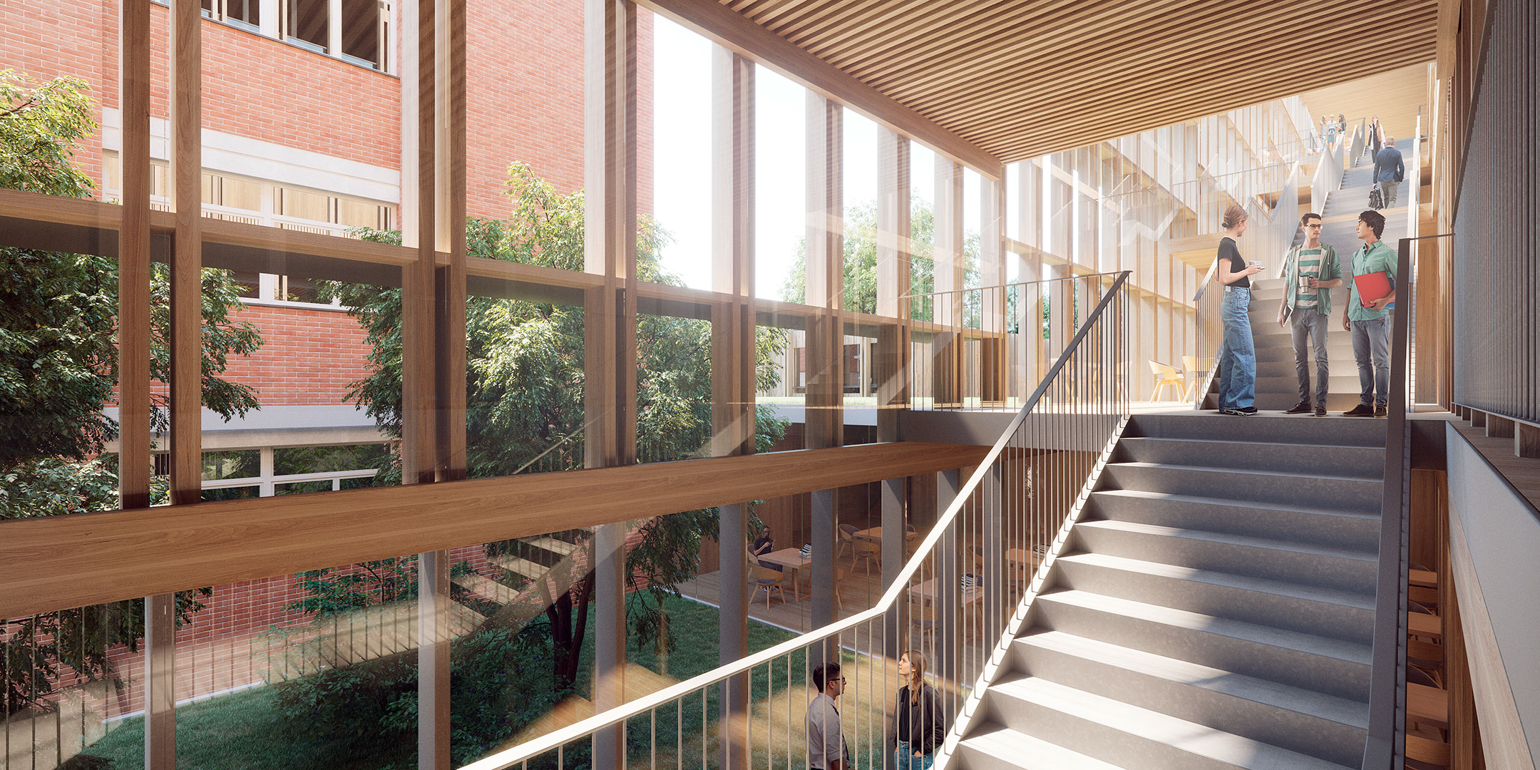 Constructivamente, el proyecto apuesta por una estructura completamente en madera, especialmente haya microlaminada (LVL), aprovechando los recursos forestales de Navarra y fomentando una economía circular. Esta elección favorece la industrialización del proceso constructivo, con beneficios ambientales, económicos y formativos para el sector.