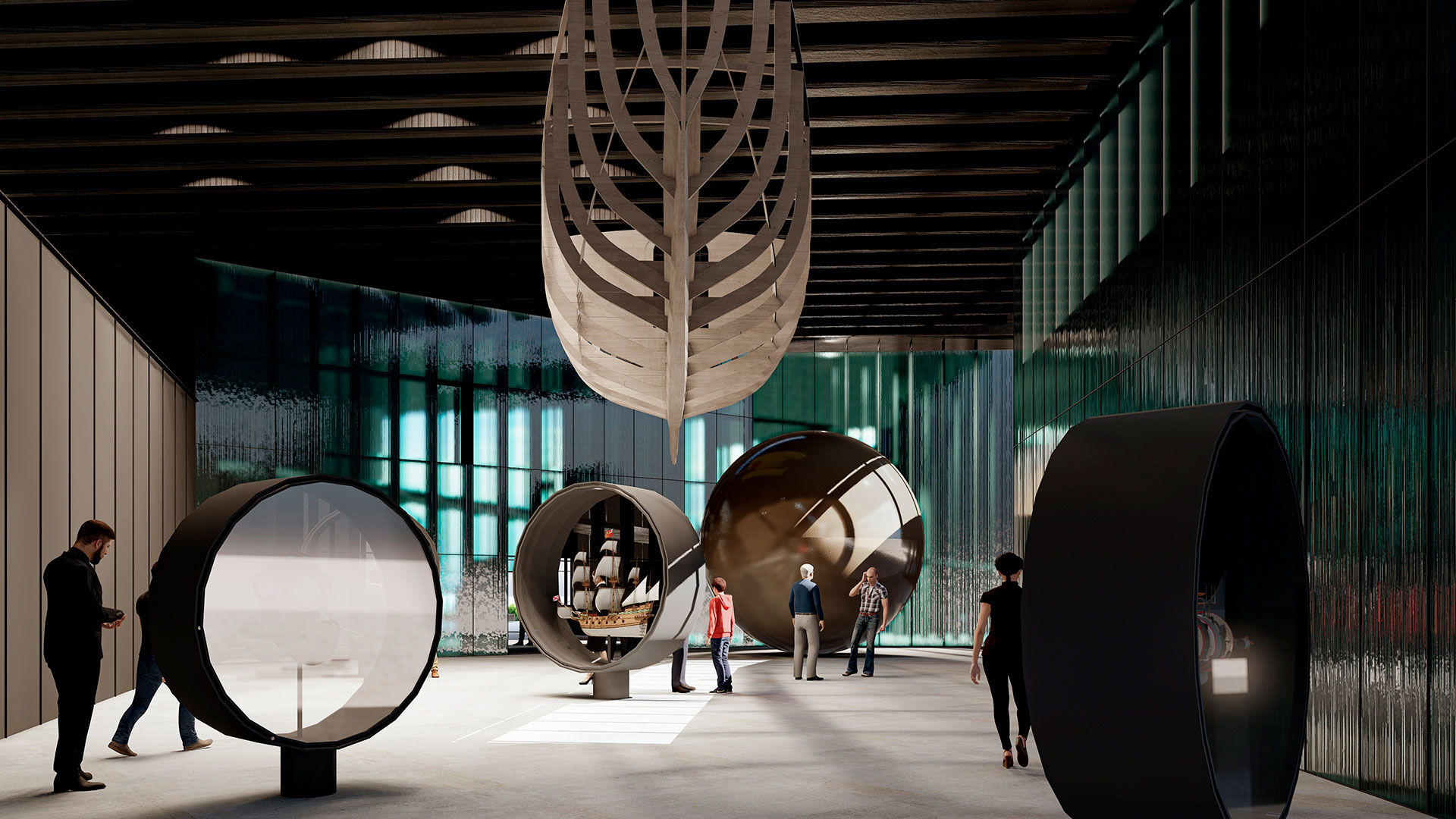 El recorrido expositivo se desarrolla en dos plantas, siguiendo un ascenso continuo que ofrece vistas elevadas de las salas y culmina con acceso directo a la zona de restauración. Los materiales como el vidrio translúcido o metales reciclados, junto con efectos de luz y reflejo, contribuyen a crear una atmósfera líquida y envolvente, coherente con el tema del agua.