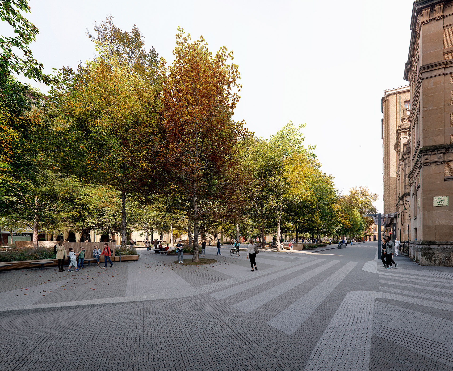 El proyecto propone transformar el Paseo de Sarasate en un espacio urbano cohesionado, accesible y multifuncional, que deje de ser únicamente un lugar de tránsito para convertirse en un auténtico “salón urbano” de la ciudad. Se plantea recuperar su valor simbólico e histórico, integrando armónicamente el casco viejo y el ensanche de Pamplona.