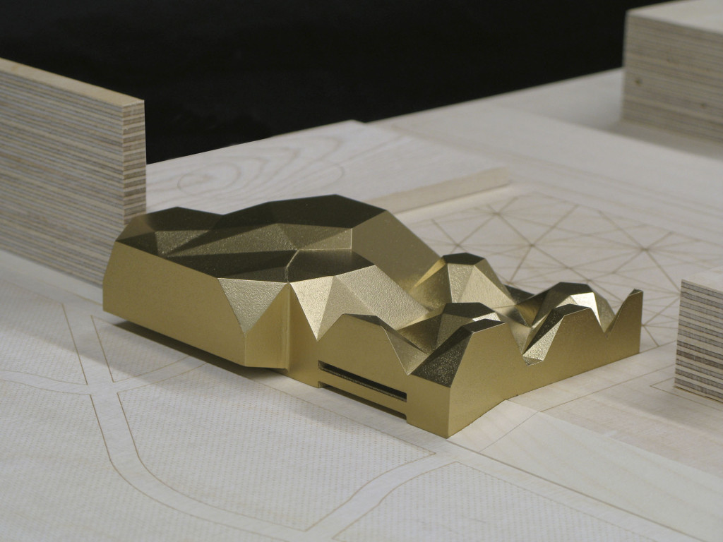 El edificio a partir de la geometría del pentágono, adquiere una expresividad que se manifiesta en los potentes volúmenes del conjunto. Una plataforma que posibilita el tránsito entre lo construido y el parque sobre el que se apoyan volúmenes que emergen buscando la máxima capacidad de representación para el edificio. Esta es la imagen que se tendrá desde la autovía y la vega. Una imagen reforzada por el uso de cerámica dorada como único material para recubrir el edificio.