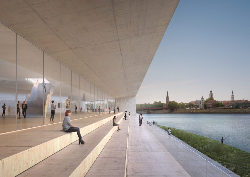 El río nos inspira la idea de una plataforma que contenga las corrientes pero que, al mismo tiempo, nos permita contemplarlo. Una plataforma orientada al norte, hacia la ciudad antigua, que al fin y al cabo es de donde pueden surgir más fuentes de inspiración, siendo también el origen más musical y teatral de ideas. Pero también una plataforma que puede interpretarse como una prolongación del barrio de Aleksotas, una salida natural al río, una forma de apropiarse de él en esta parte de la ciudad.