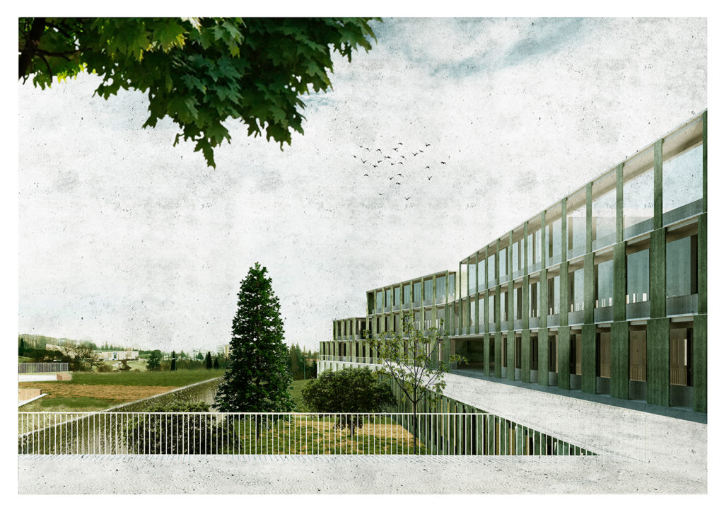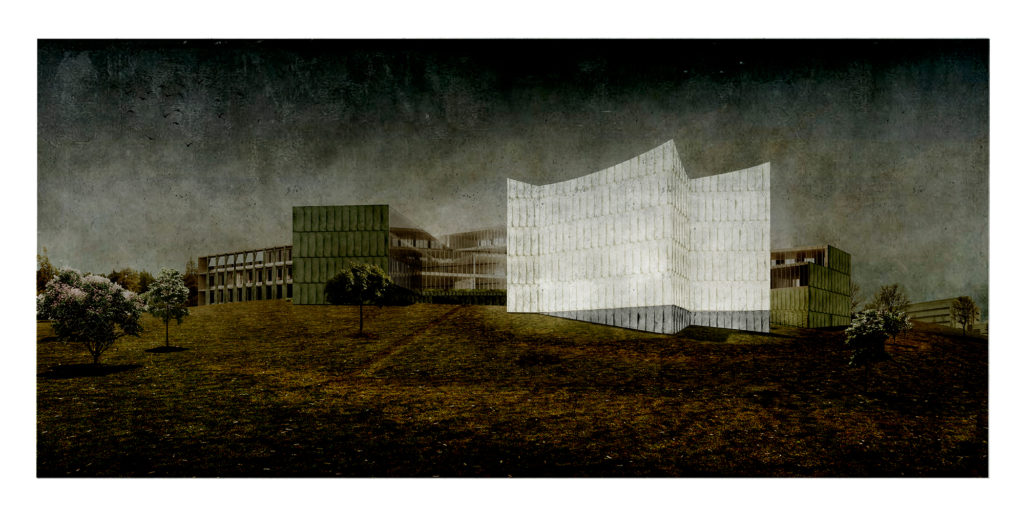Síntesis paisajística que se refleja en el hecho de que el edificio es un lugar de encuentro entre un plano elevado, una suerte de plataforma horizontal y una abrupta topografía que desciende hacia el sur, hacia el parque-campus. Un edificio que, desde abajo, se contemplará como un “faro”, una referencia con tintes simbólicos a la vez que, visto desde arriba, será el “mirador” que proyecta su magia hacia el campus bajo.