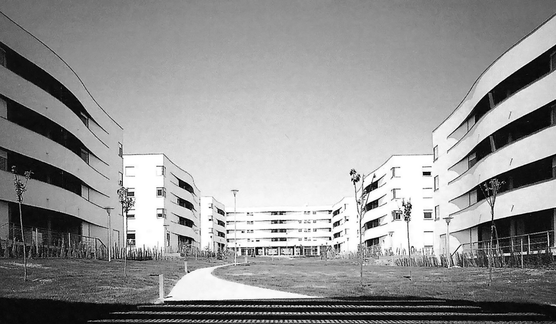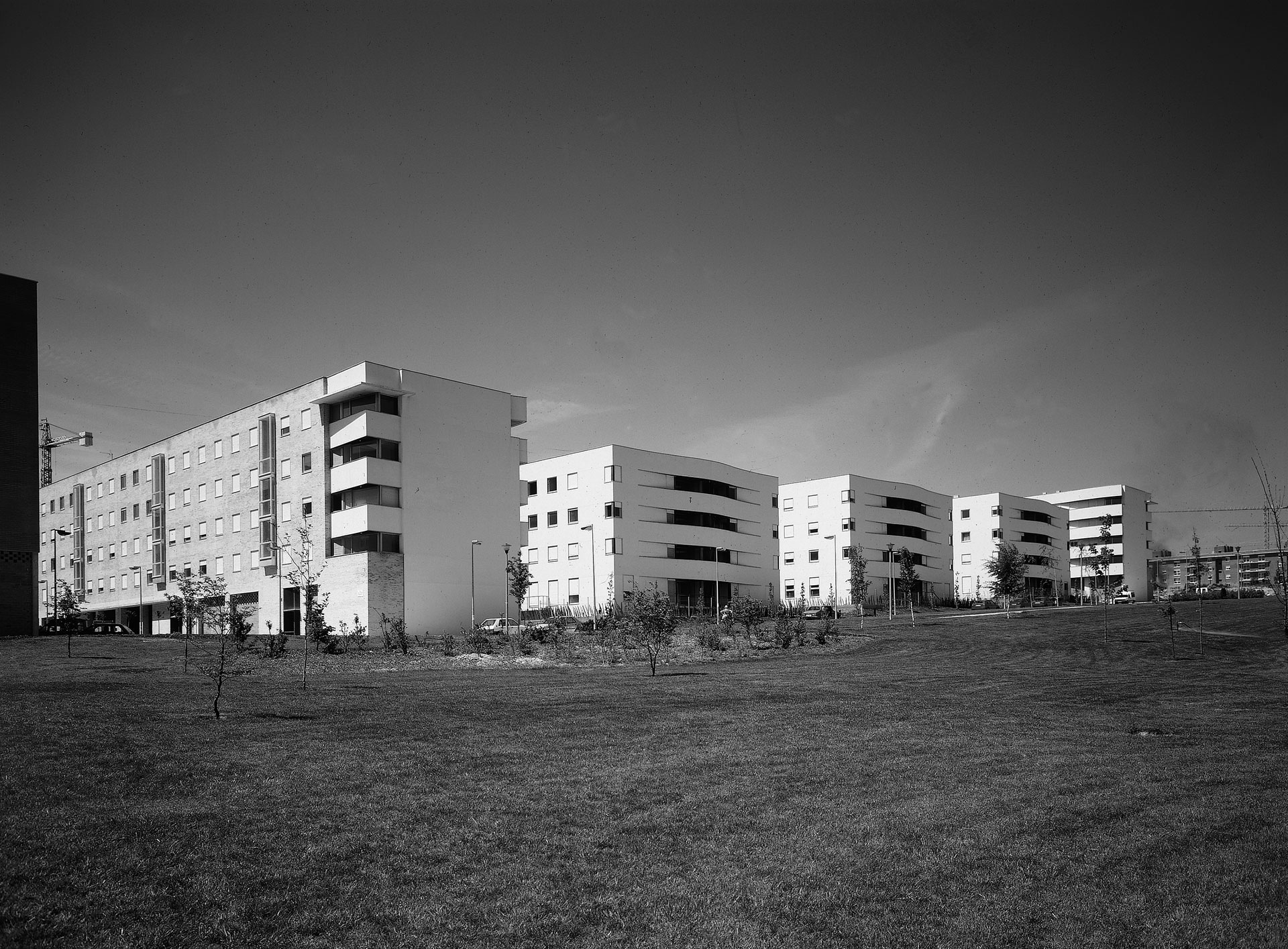 El edificio se localiza en Mendillorri, un área de nuevo crecimiento en el entorno inmediato de Pamplona. Se trata de un área, dedicada fundamentalmente a vivienda social, de baja densidad y gran cantidad de espacios verdes. El proyecto de la unidad residencial desarrolla una de las manzanas abiertas determinadas en el planeamiento. Toda la propuesta se estructura en coherencia con los principios que inspiran la ordenación general y, de manera más específica, con los que buscan la continuidad y a la vez la diferenciación entre las dimensiones pública y privada de los espacios. La imagen del conjunto y los aspectos tipológicos se consideran desde esta perspectiva, que pretende ser coherente con el proceso general del proyecto de urbanización.