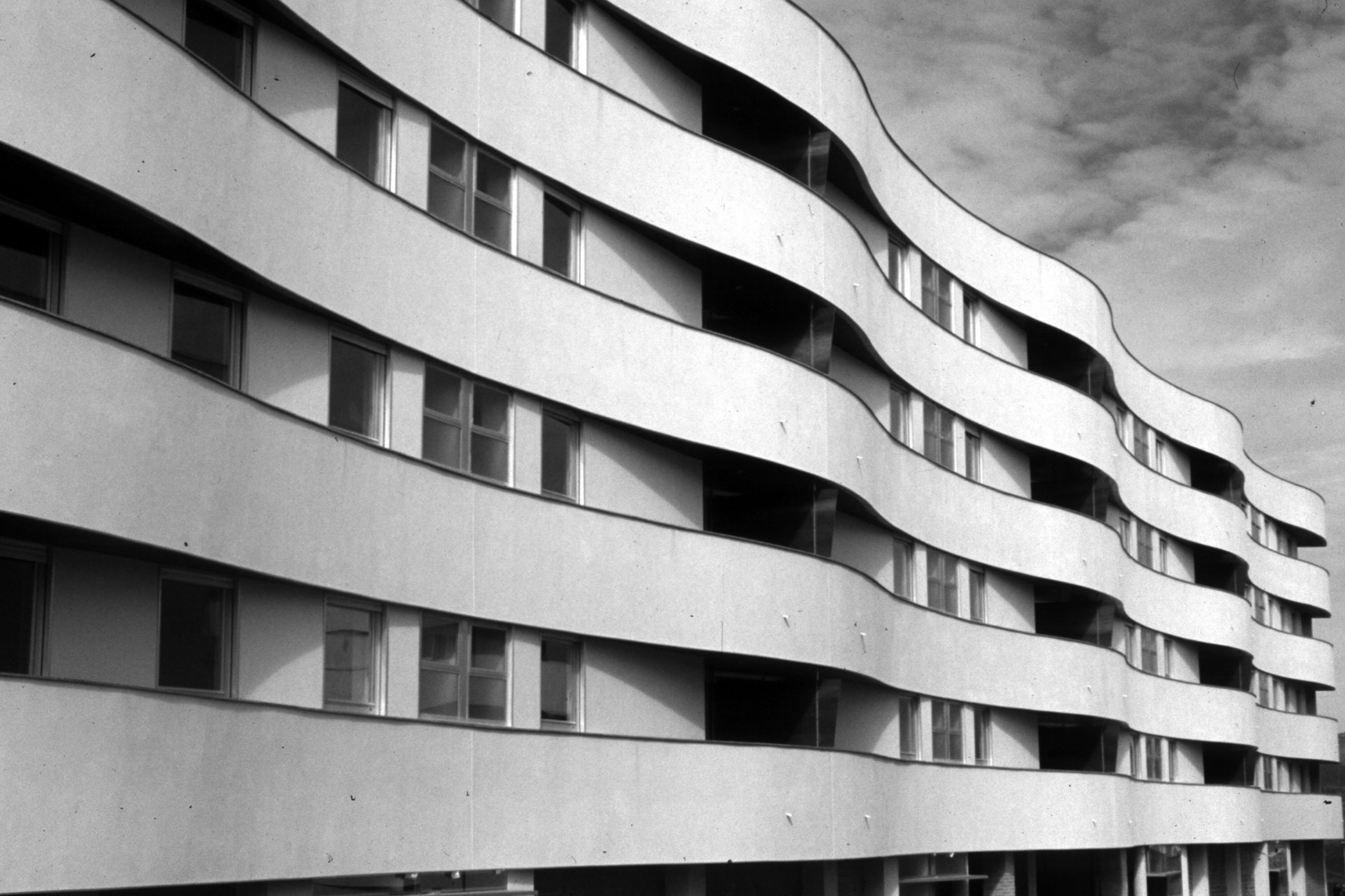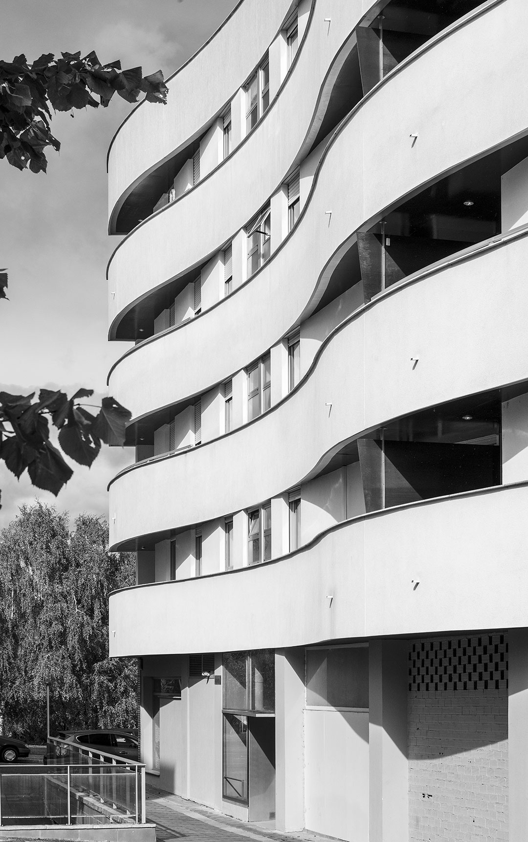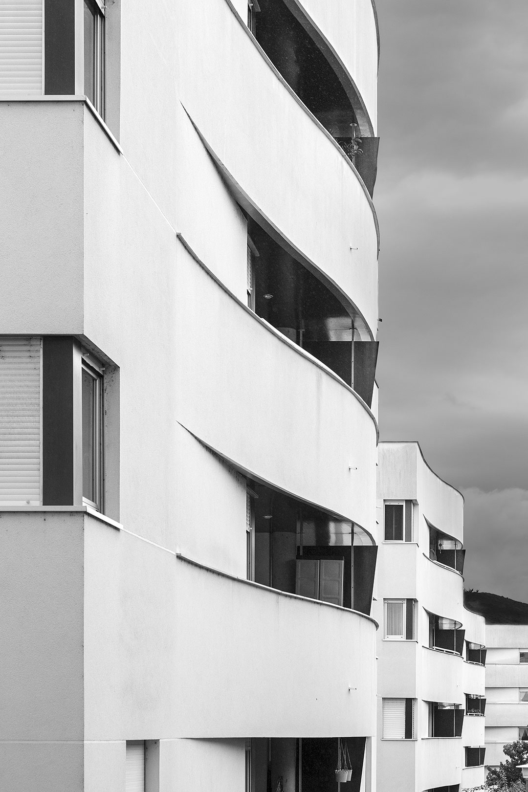 El ritmo ondulado de estas fachadas que corresponden a los estares permite crear un cierto juego compositivo y lograr un conjunto que adopta pieles distintas en función de su situación: formales hacia las calles y «juguetonas » hacia el interior.