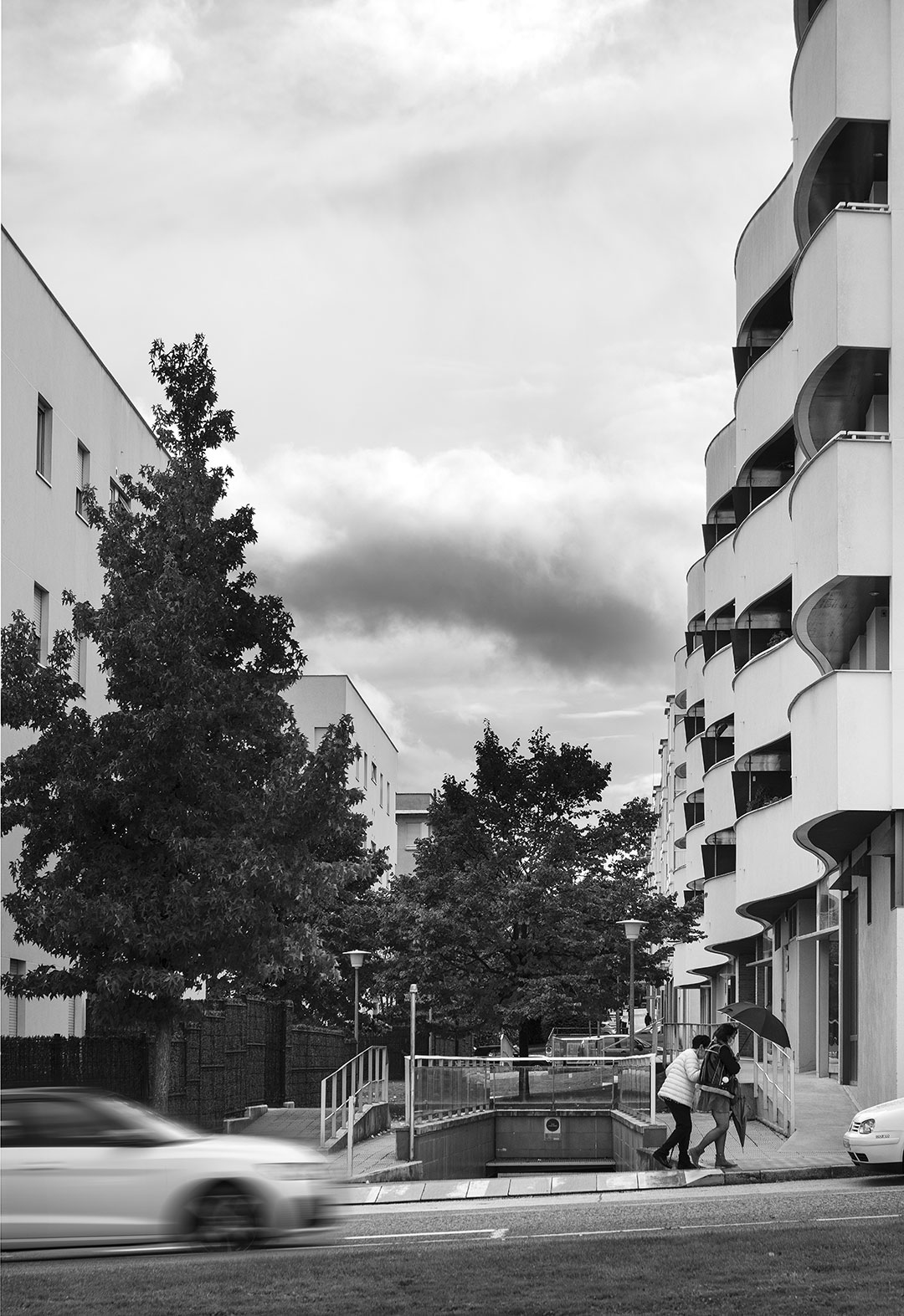 Se ha concedido gran importancia al diseño de los espacios de uso común, tanto en el tratamiento material como en su iluminación. En este sentido, los pequeños bloques cuadrados, con una dimensión de 22 x 22 metros, incorporan a esta tipología más o menos tradicional —formada por cuatro viviendas en esquina—, un espacio libre a lo largo toda la altura del bloque que, iluminado por un gran plano circular de vidrio, quiere representar en cierto modo la continuidad con el espacio exterior además de permitir y aglutinar los accesos a las viviendas.