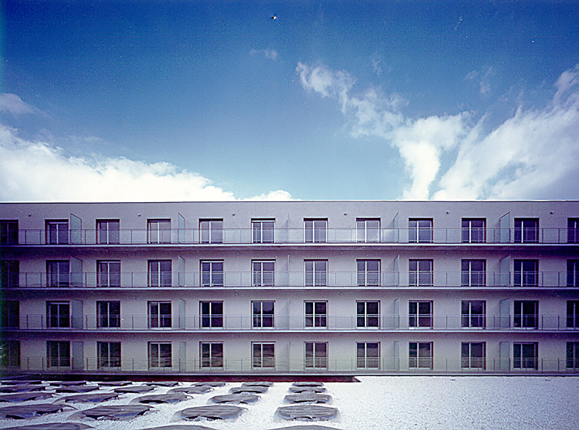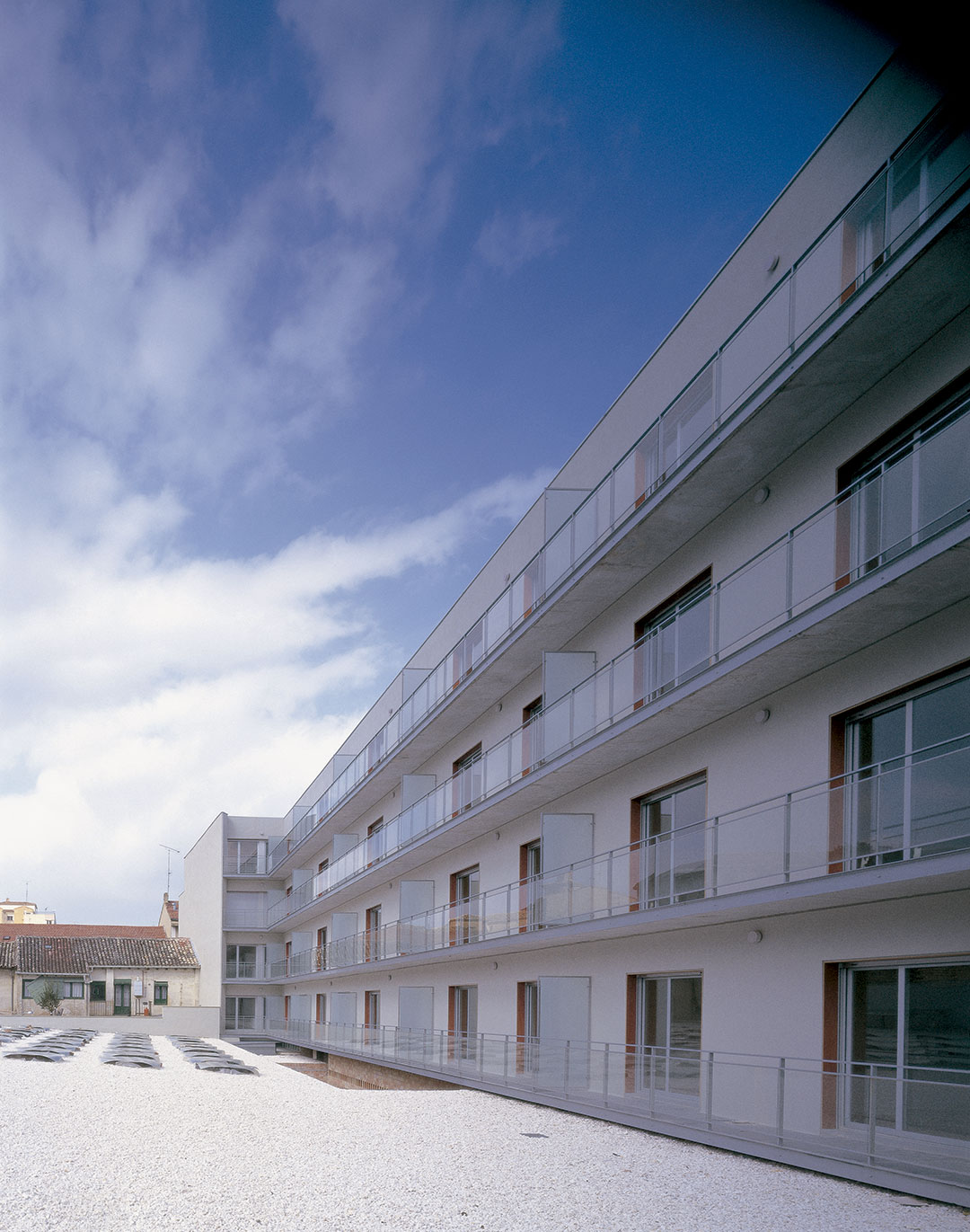 Las viviendas que se alinean a lo largo del paseo se organizan condicionadas por la profundidad de crujía —18 m—, así como por la decisión de plantear la estructura según unos «pilares pantalla» que definen unas líneas estructurales, perpendiculares al paseo, y una geometría que recuerda la manera histórica de ocupar el área.