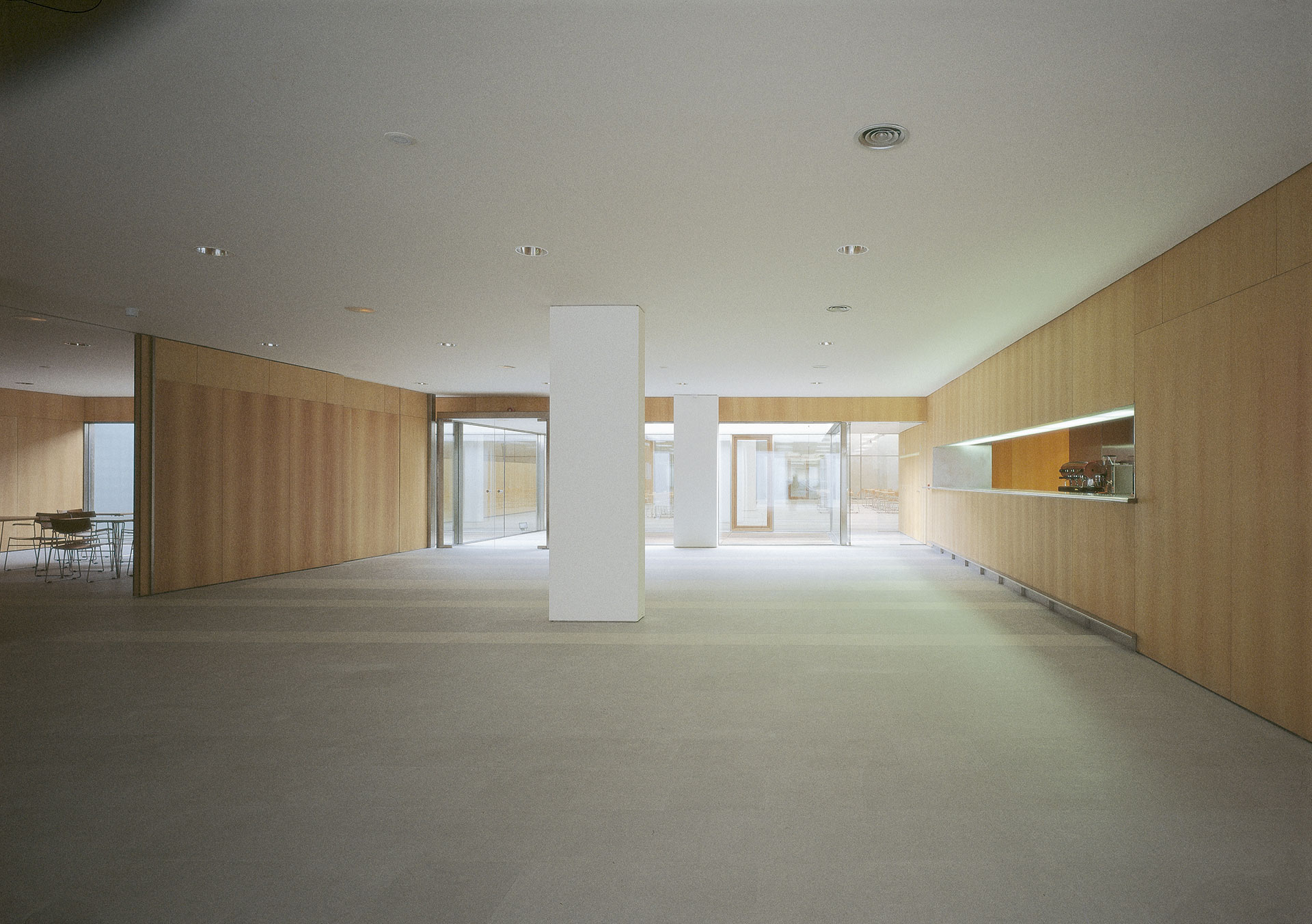 Dos áreas bien diferenciadas, pública y privada, la pública orientada al paseo, la privada hacia un gran espacio interior de manzana, se organizan articuladas por pequeños patios, revestidos de chapa de aluminio, que iluminan los accesos y los volúmenes de vidrio que contienen las cocinas de las viviendas.