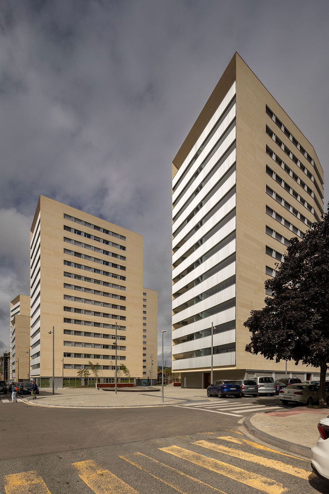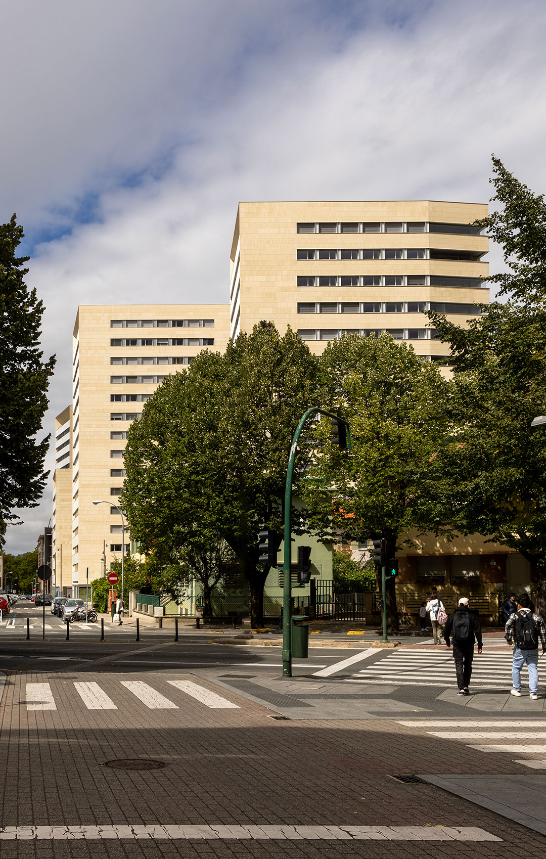 Los volúmenes se ordenan según un esquema de trazas paralelas a la dirección NE-SO dentro de la traza básica de las manzanas del ensanche, de modo que el juego de aquellos acentúa el sentido de transparencia o profundidad desde la ciudad hacia el paisaje al norte, sin perder la referencia a la escala de la manzana.
