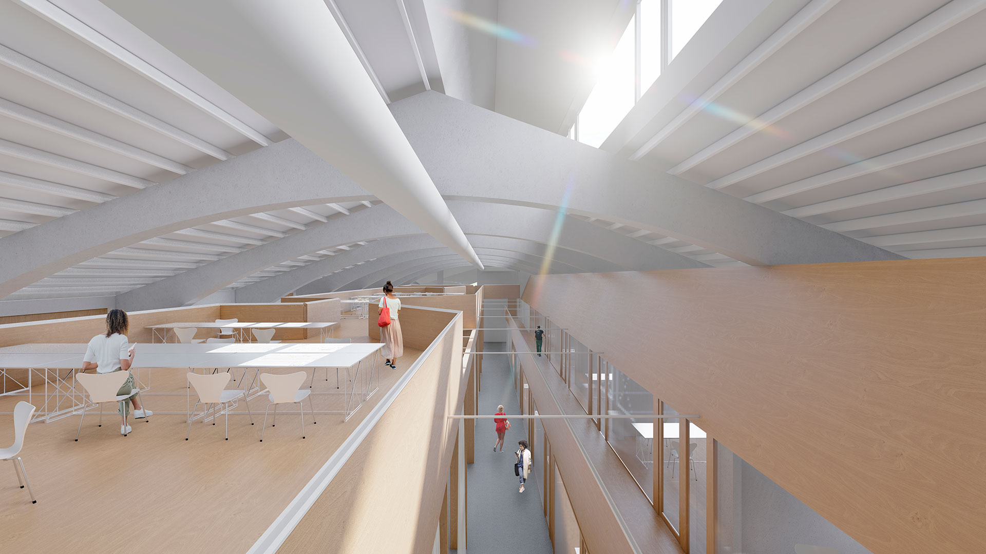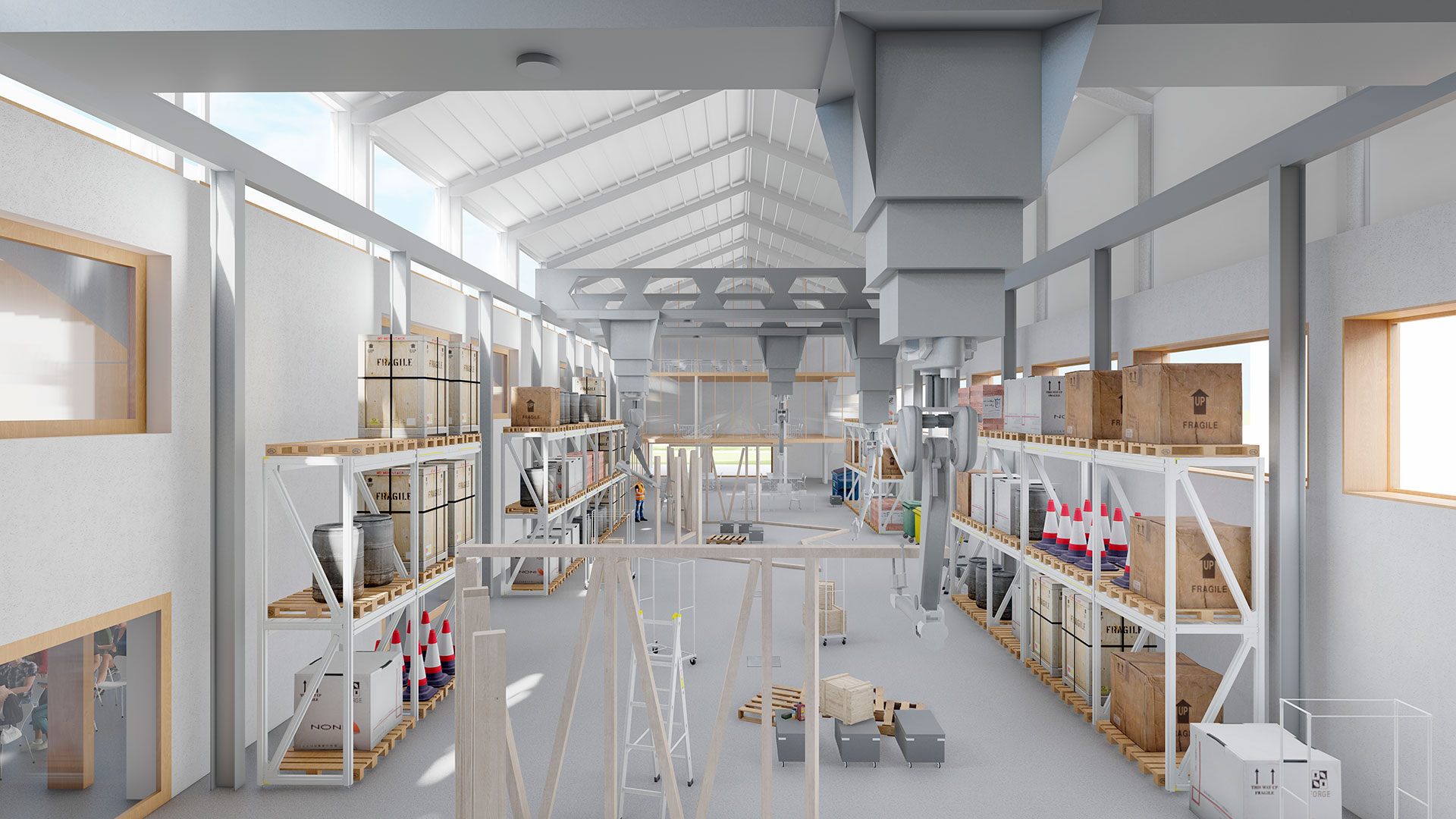 La intervención en el interior sigue el criterio funcional de dejar los espacios lo más libres posible. Así ocurre en la nave que se dedicará a investigación y desarrollo en la que únicamente se propone, junto a la entrada principal del edificio tres niveles elevados que contendrán los talleres y almacenes de maquetas, dejando el resto de la nave libre para el manejo de los robots. En la nave derecha se propone una construcción ligera con estructura de madera pintada que contendrán los distintos usos como aulas, talleres de proyectos, despachos y exposiciones.