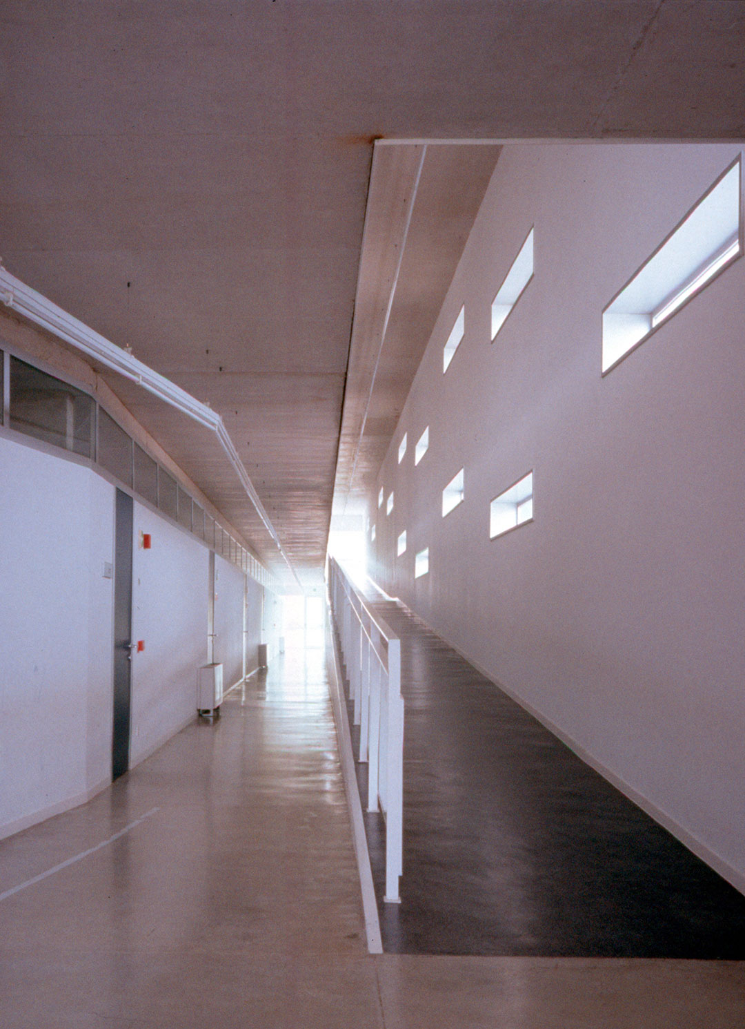 El gran bloque cuadrado, con el gimnasio a doble altura se prolonga en su planta de sótano a través de una gran superficie de vidrio y mediante una depresión voluntariamente provocada en el terreno con las zonas deportivas del exterior. De esta forma, el límite dentro-fuera todavía es más imperceptible.