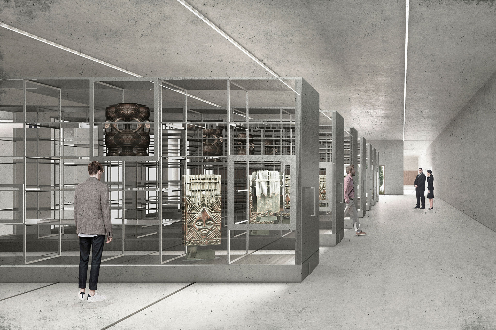 El recorrido del museo se organiza en una circulación descendente, que comienza en la cota más alta y finaliza en el “jardín colgante”, un espacio abierto para eventos y contemplación. Se combinan recorridos interiores (accesibles con rampas suaves del 6%) y exteriores (un paseo perimetral que conecta distintos puntos sin necesidad de entrar al museo). En niveles inferiores se ubican áreas de administración, almacenes y servicios, conectados mediante ascensores y montacargas.