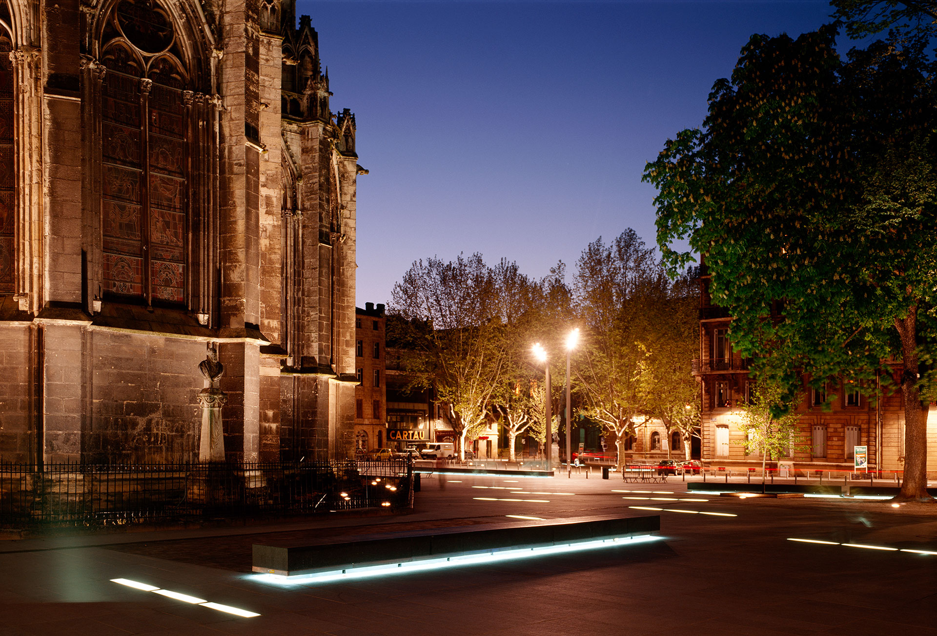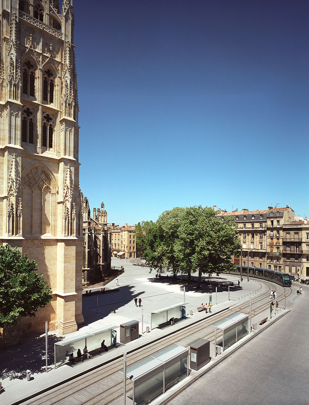 En este sentido el tranvía, como nuevo instrumento público de tráfico, silencioso y económico, adquiere una importancia fundamental que se manifiesta en el tratamiento del pavimento así como en el valor escenográfico que adquiere: nueva tecnología limpia para un espacio histórico. Y el espacio existente entre el ábside de la catedral y la torre, o el paseo repleto de árboles que discurre en el lado sur ven intensificado a partir del nuevo diseño su carácter de “jardines de la catedral”, de lugares privados de estar, sin que se pierda por ello la unidad del conjunto. El adoquín de madera y las variaciones del pavimento de granito ilustran esta realidad.
