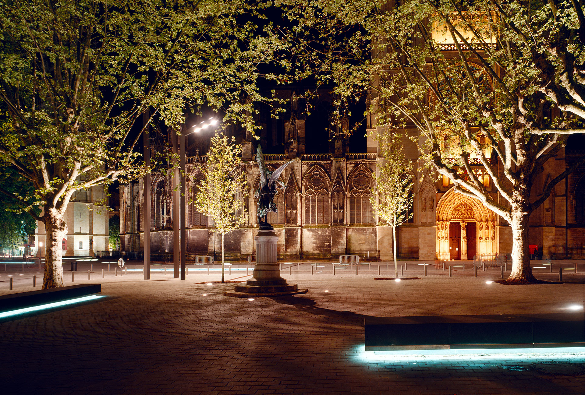 La propuesta presentada incorpora la Catedral como pieza histórica de extraordinaria importancia, pero también como elemento capaz de generar “energías” urbanas, al resto de la ciudad. El vacío generado como consecuencia de la supresión de elementos distorsionantes – fundamentalmente todos los referidos al tráfico actual – se ve ocupado por un pavimento continuo repleto de contrapuntos y referencias a la Catedral. Las antiguas losas que cubrían las tumbas en el interior del templo se dispersan en forma de superficies de luz y fundición que navegan libremente en medio de un “mar” de granito que invade toda la superficie y que permite el uso totalmente peatonal de la plaza.