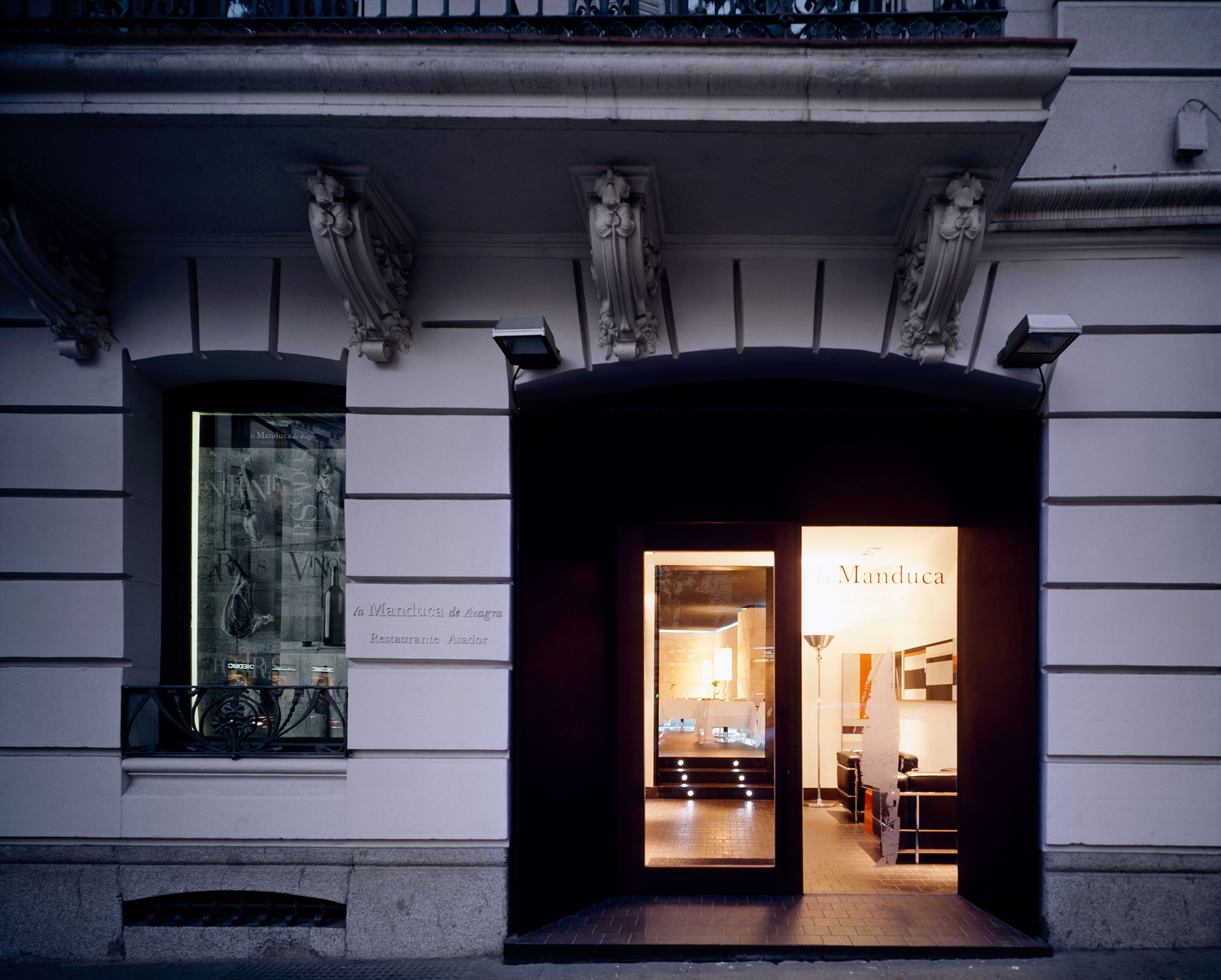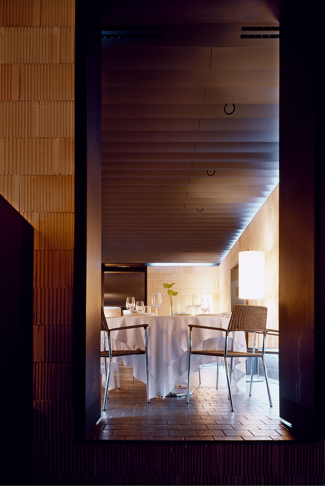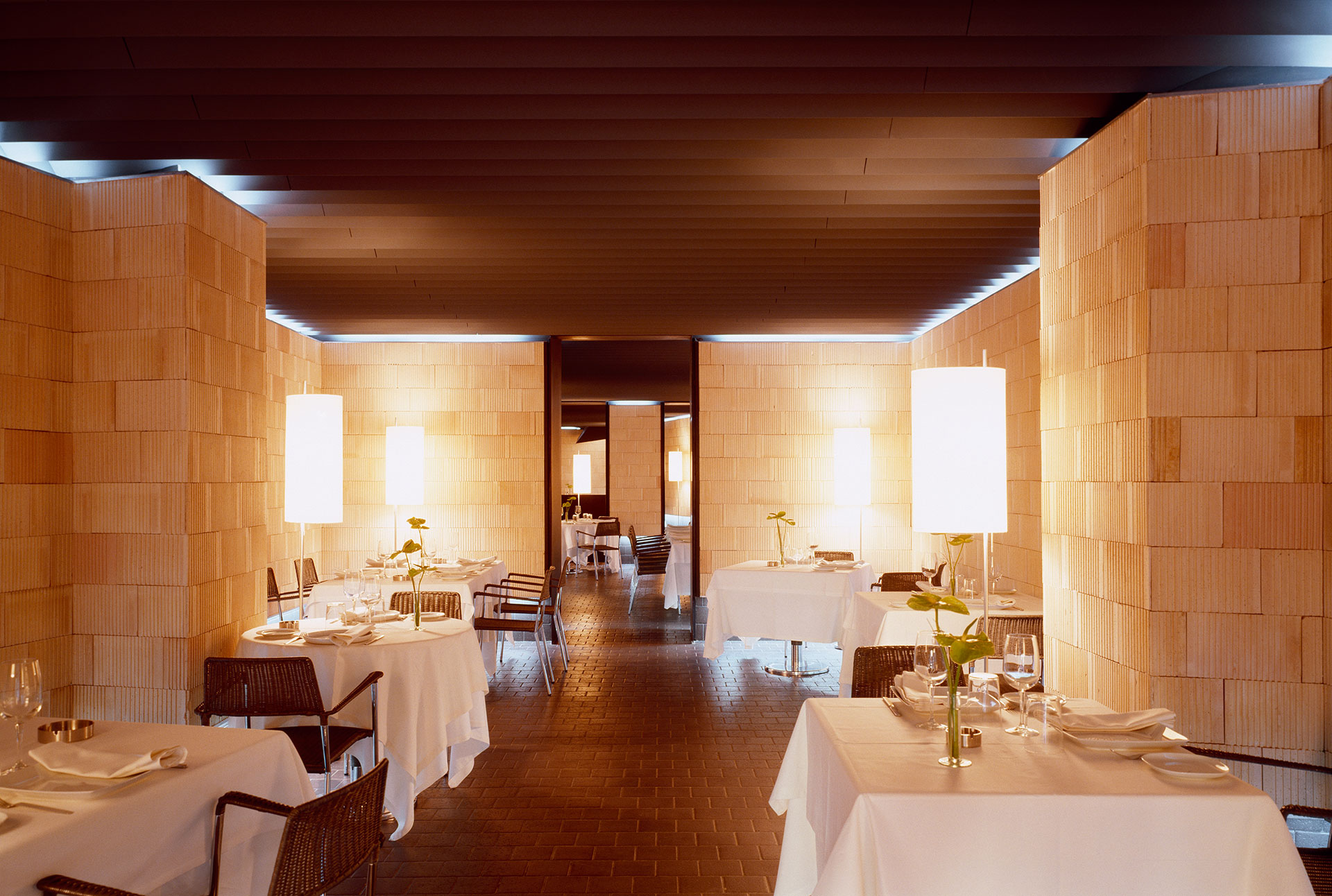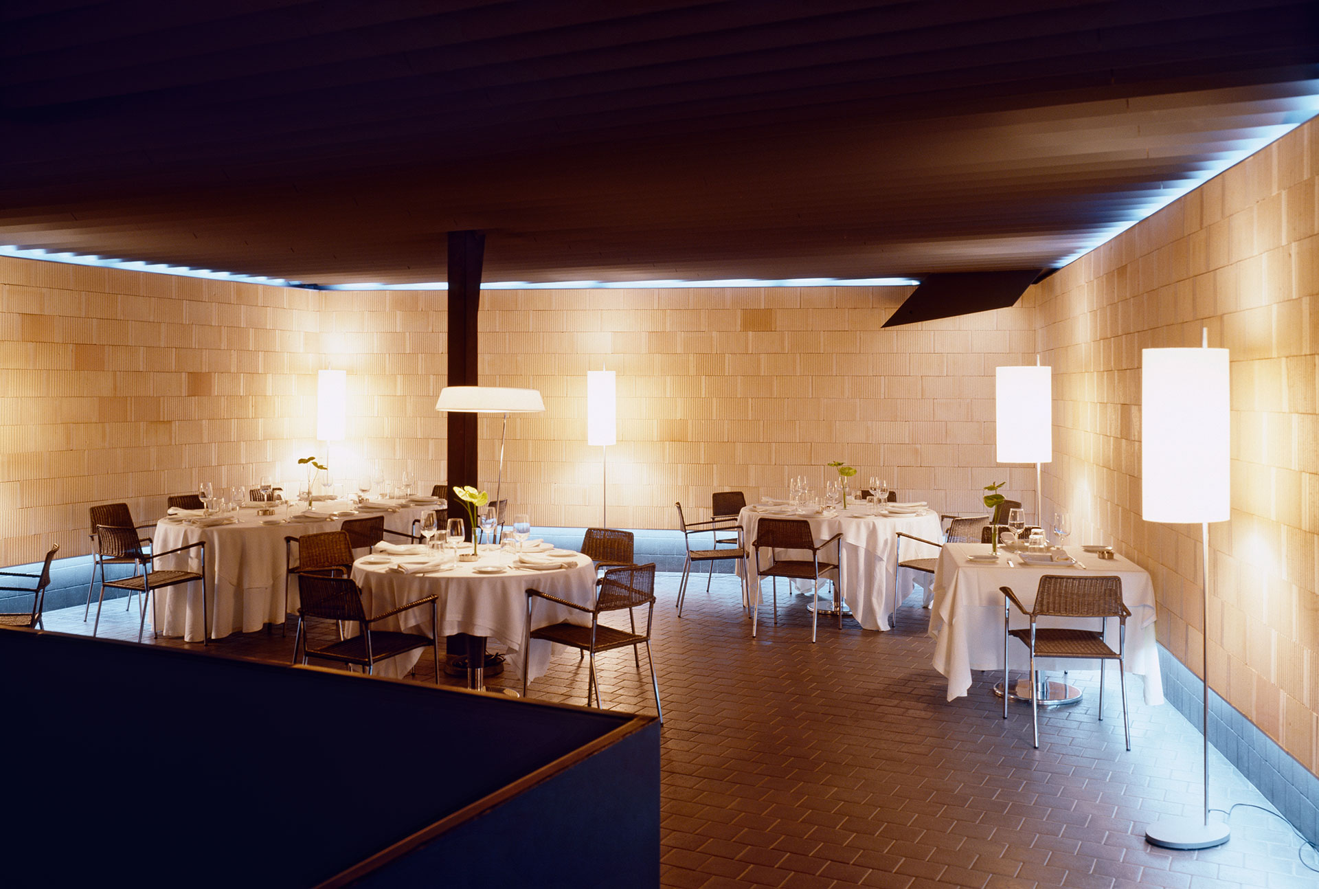 Los distintos espacios se van sucediendo a partir de la entrada permitiendo así ordenar el restaurante de una manera agradable en sucesivos comedores, huyendo de una presencia excesivamente multitudinaria a la hora de “abordar el plato”.Sólo tres materiales se utilizan en el local. Los tres naturales y modestos. Los planos verticales están revestidos del bloque cerámico que habitualmente se utiliza para ejecutar los tabiques divisorios de vivienda económica. Estos bloques, siempre enlucidos y ocultos, presentan al dejarse descubrir una textura que adquiere gran valor a partir de la repetición y del reflejo de la luz. Los pasos entre los muros de carga quedan perfilados con chapas negras barnizadas destacando así la transición que el grosor de estas construcciones, aumentado con la superposición de la cerámica, supone.