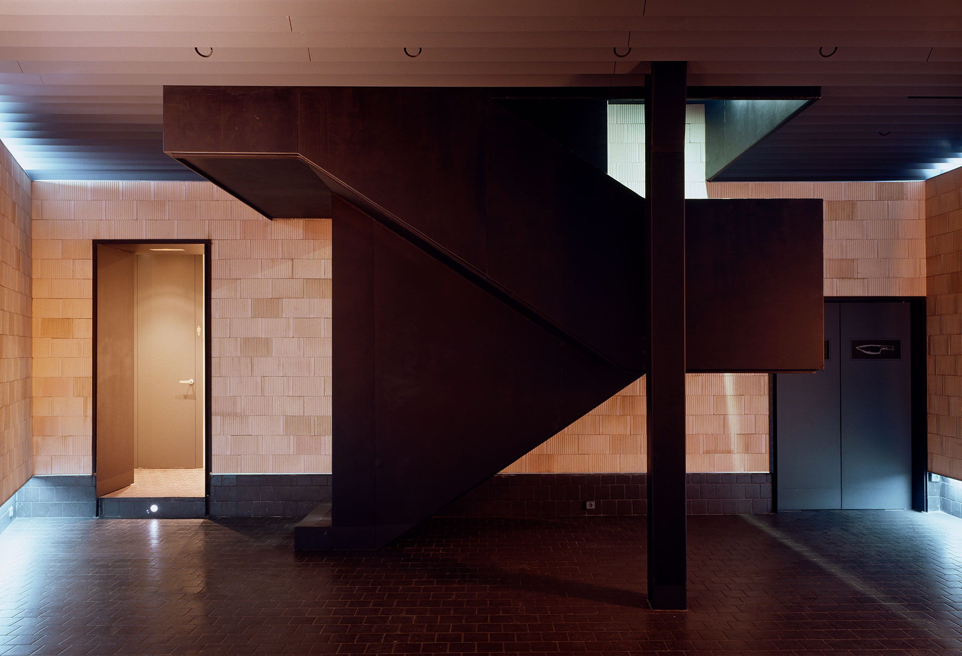 La misma chapa se utiliza para rehacer la escalera principal que, aun mantenida en la misma posición, sufre modificaciones puntuales tendentes a simplificarla y a valorar su carácter volumétrico dentro del espacio, de mayor altura, en el nivel en subsuelo. Un pavimento cerámico, negro y algo rugoso, que cubre parcialmente una altura de las paredes ofrece junto al techo un marco neutro donde destacar la iluminación.